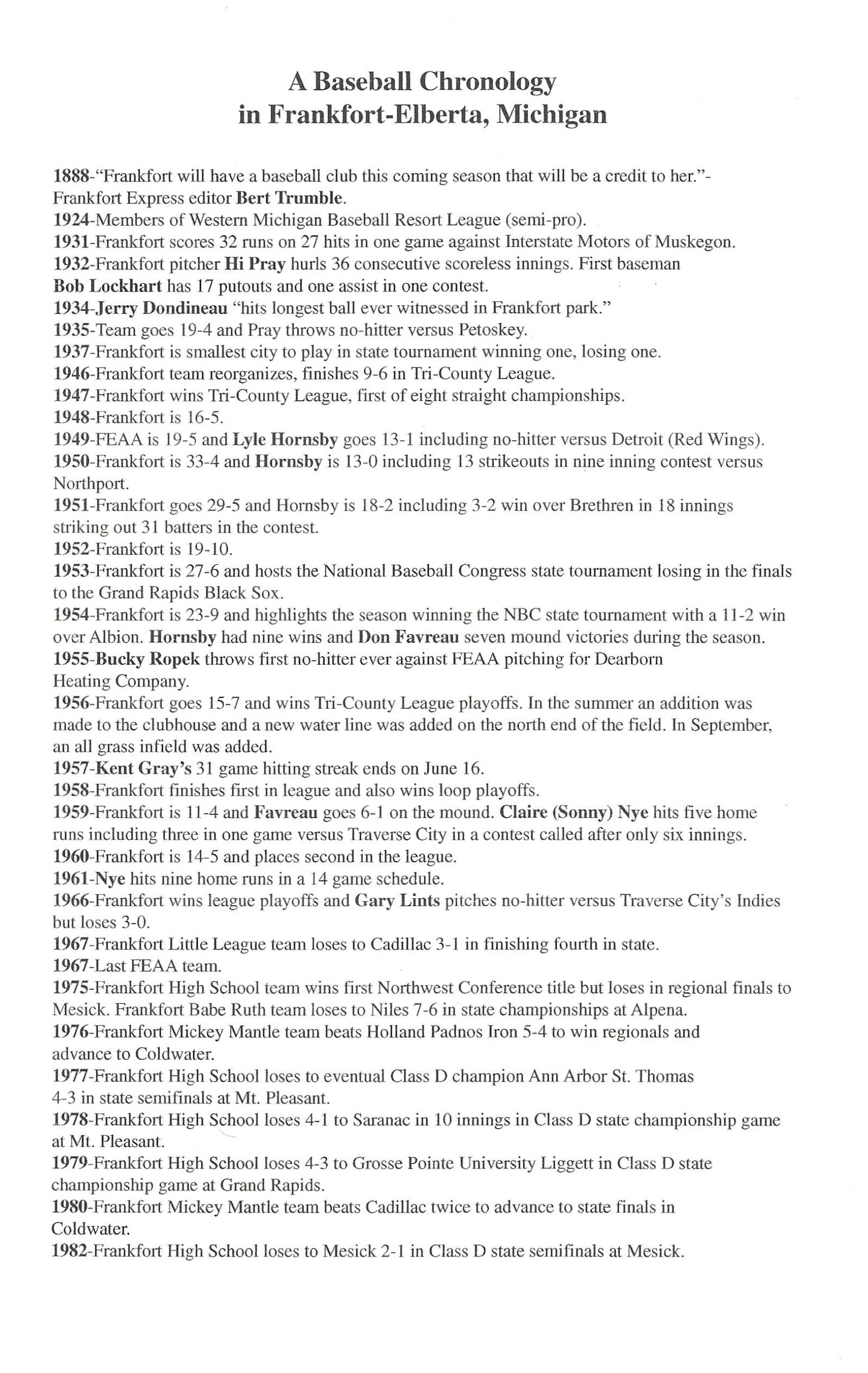 “The Frankfort-Elberta area has had a long and successful history in the sport of baseball reaching the pinnacle of its success in 1954 when it became the smallest community ever to win the National Baseball Congress men’ semiprofessional state title.”
